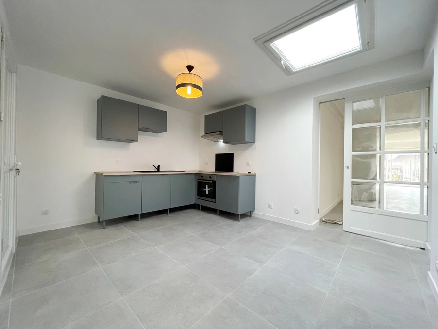 Après un escalier d'accès privatif au 1ier étage, l'entrée s'ouvre sur un séjour de 45 m² auquel s'ajoute une cuisine équipée, aménagée de 15 m² et une buanderie attenante.