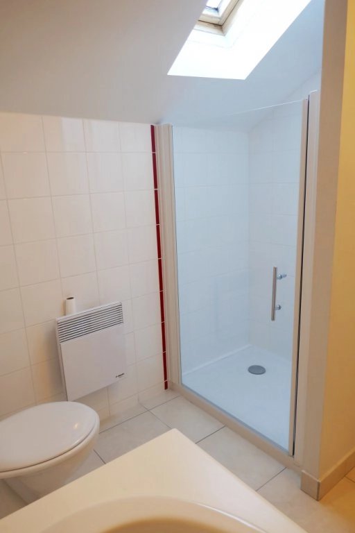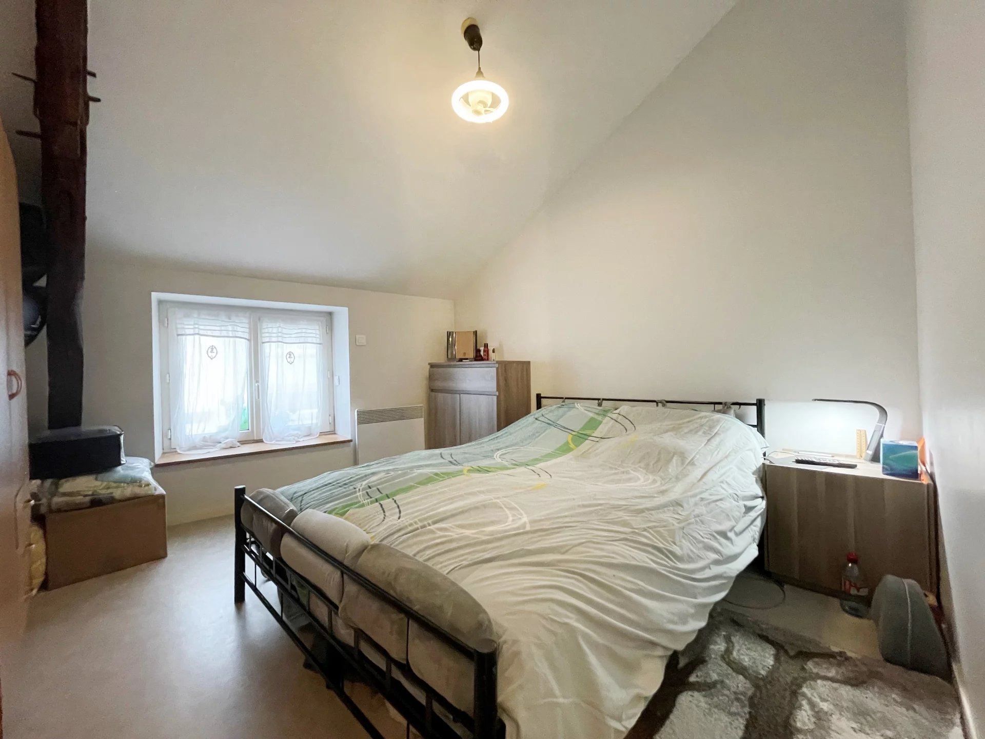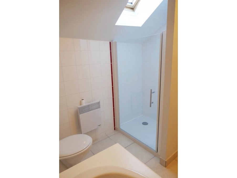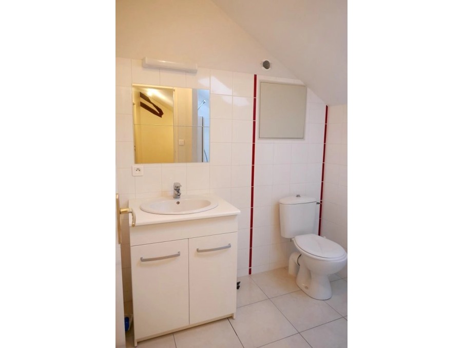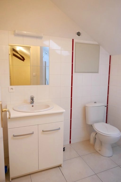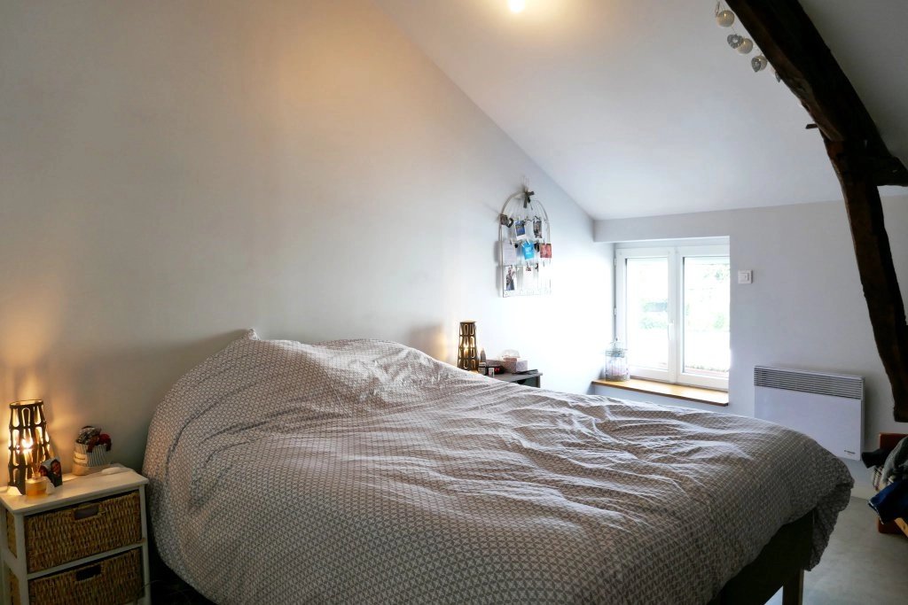 A l'étage : 2 chambres spacieuses avec le charme des charpentes apparentes + 1 salle d'eau avec douche.