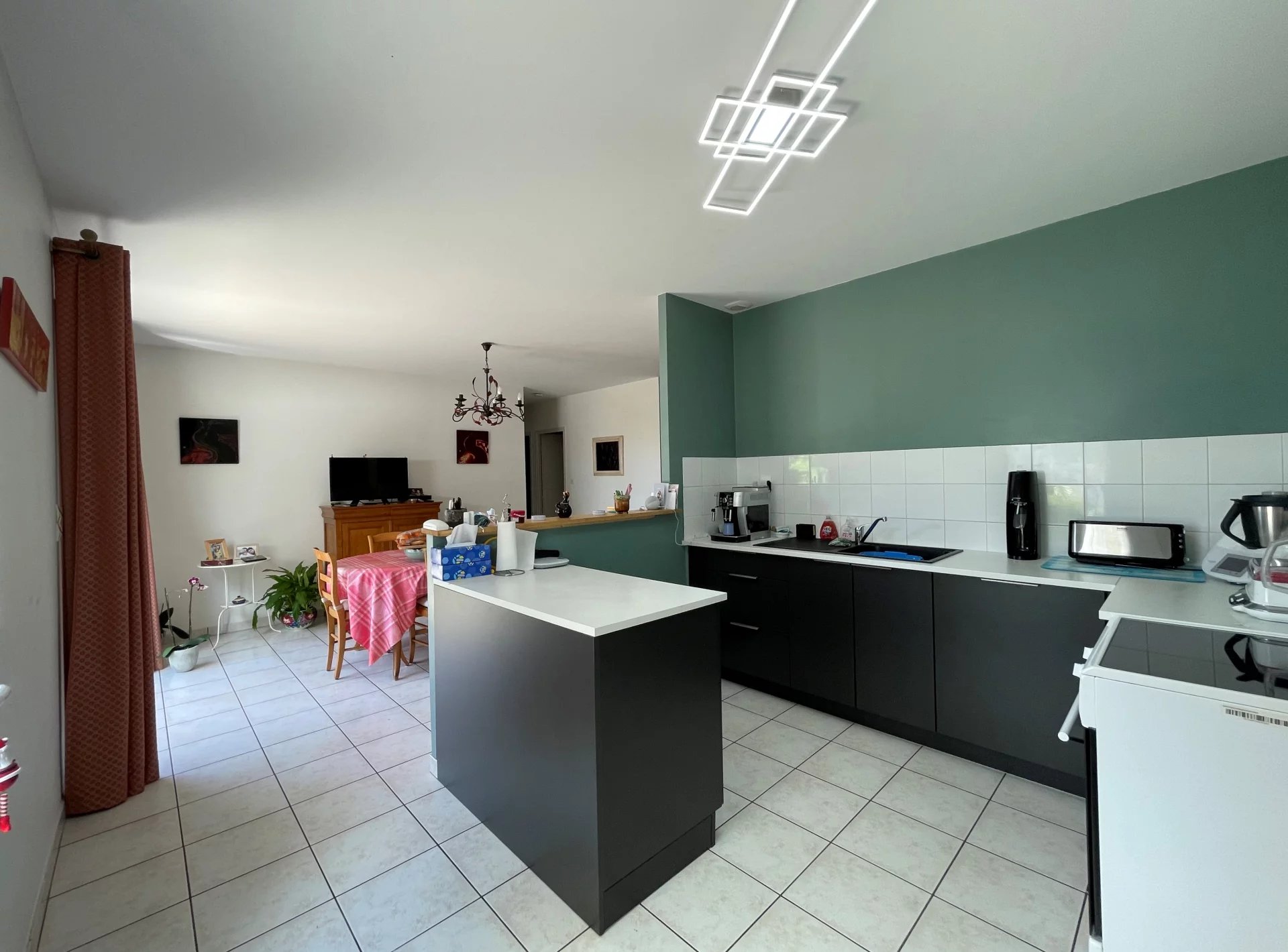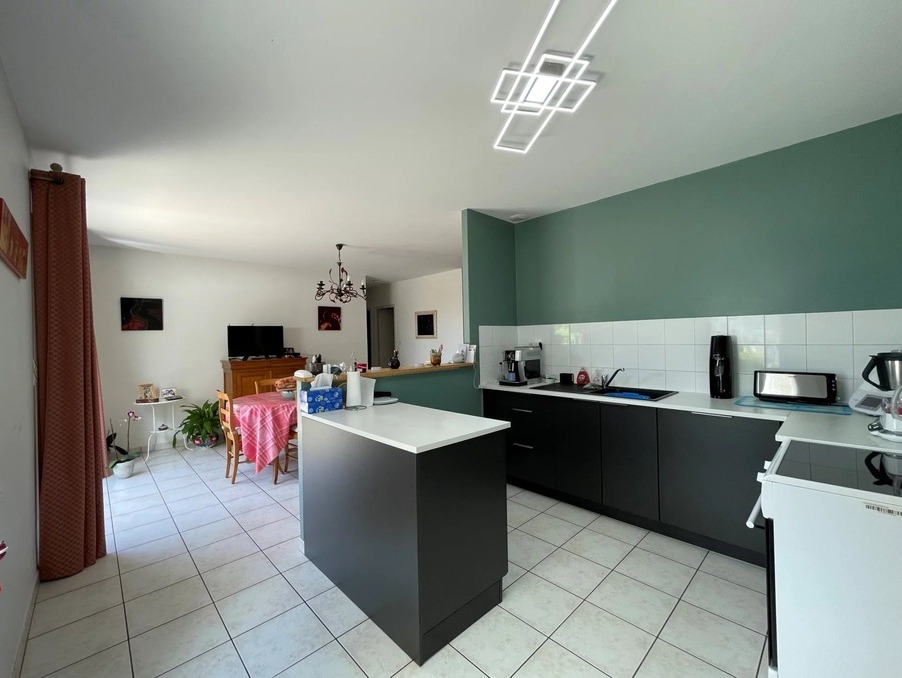 Le séjour de 33 m² offre un grand coin salon et un bel espace salle à manger avec sa cuisine ouverte aménagée et équipée.