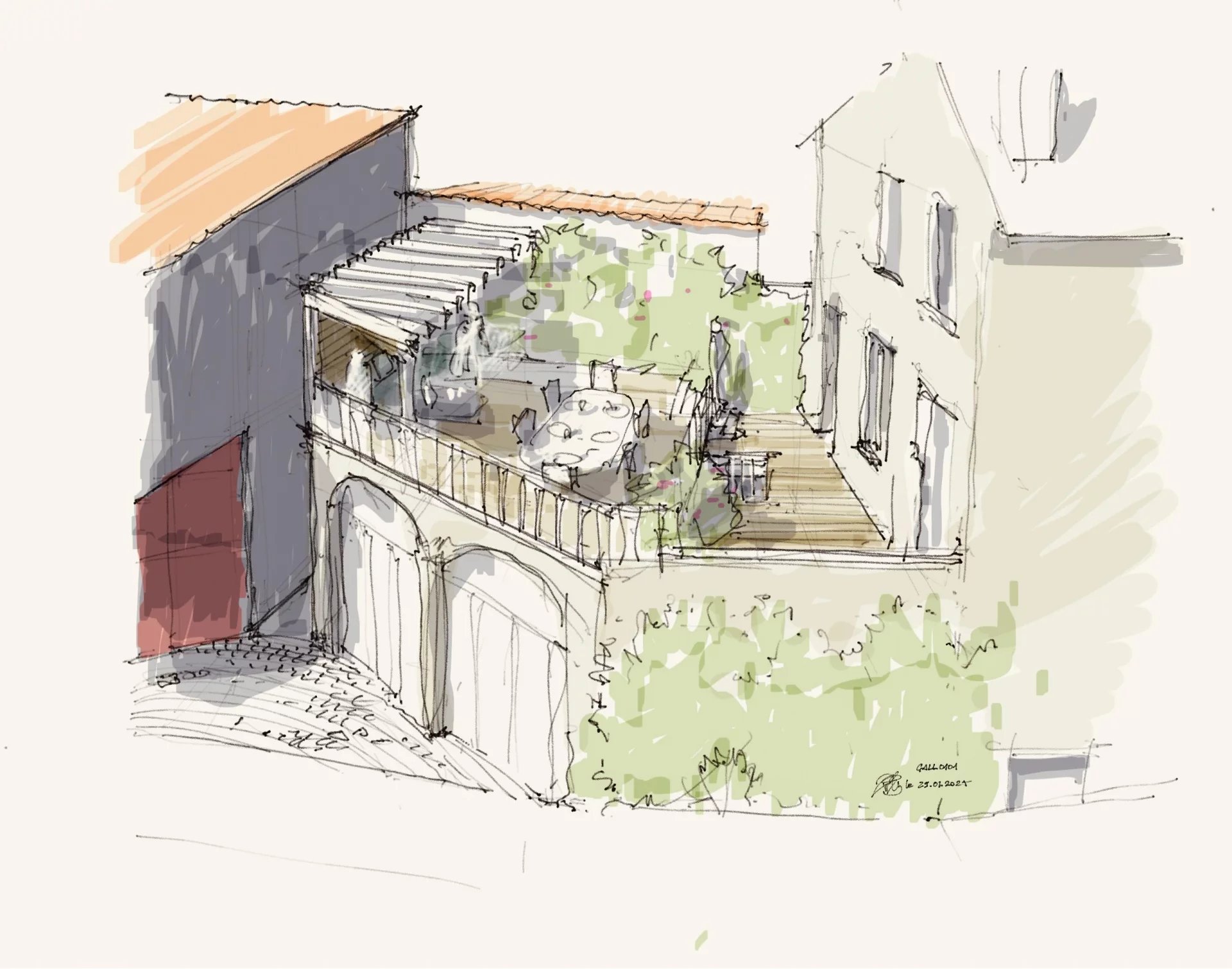 A l' extérieur, le parti pris est clair et assumé : pas de contraintes d’entretien d’un espace vert, mais une cour à finir d'arranger en patio avec quelques plantes méditerranéennes par exemple.